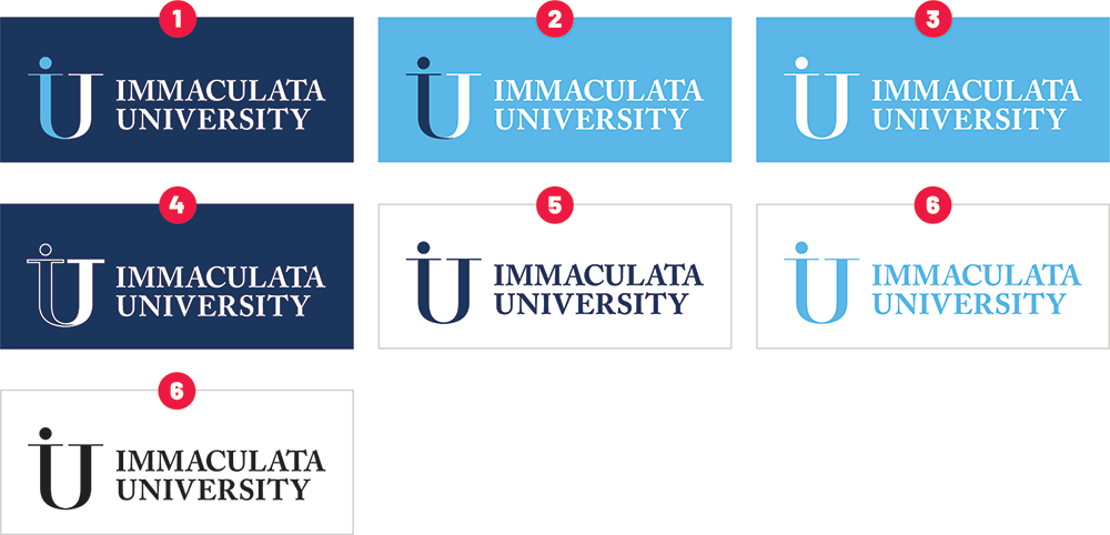 The University IU logo should maintain the equivalent of the height of “MAC” from “IMMACULATA” around the mark on all sides, ensuring the logo is sized proportionally to the size of the collateral. The minimum width of the stacked logo should be no smaller than 0.8212”, while the minimum width of the horizontal logo should be no smaller than 1.75”. Contact University Communications and Marketing with any questions regarding logo size, color or placement.