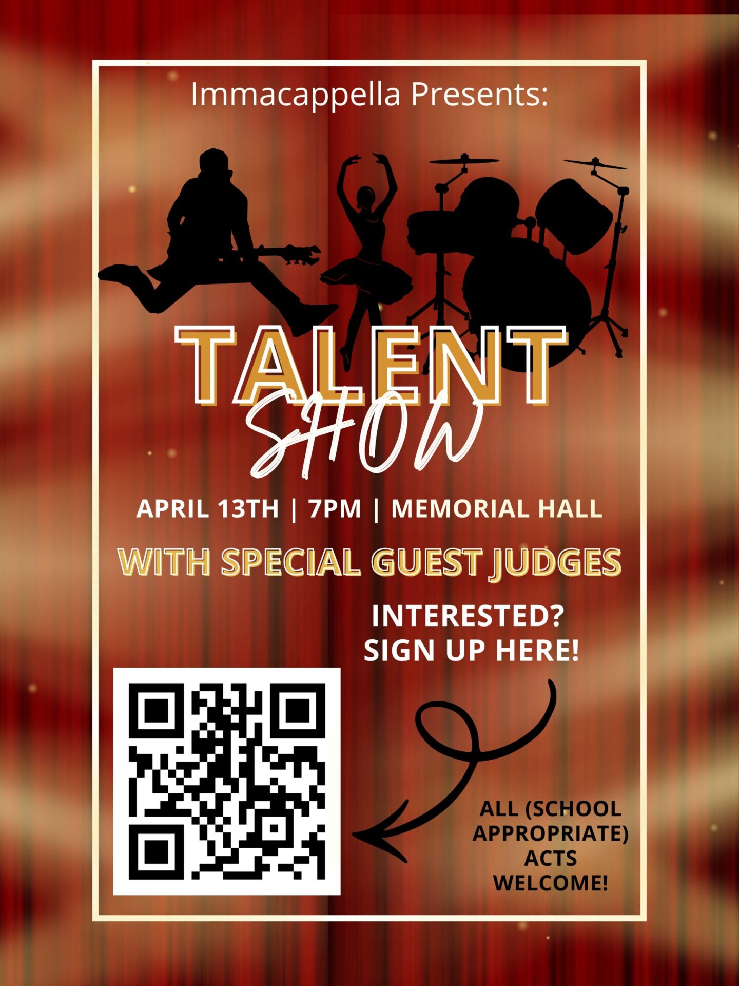 Immaculata University Memorial HallCome show off your talents at Immacapella's annual Talent Show! You can sing, dance, act, do stand up comedy, and more!