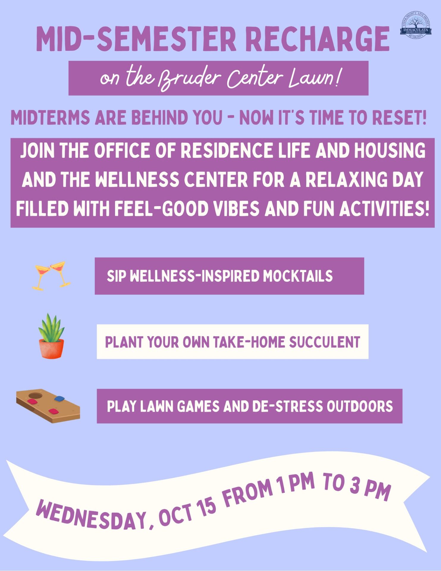 Bruder Center Lawn Immaculata, PA, United StatesCome for a fun filled mid-semester recharge with fun activities and mocktails!